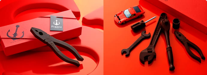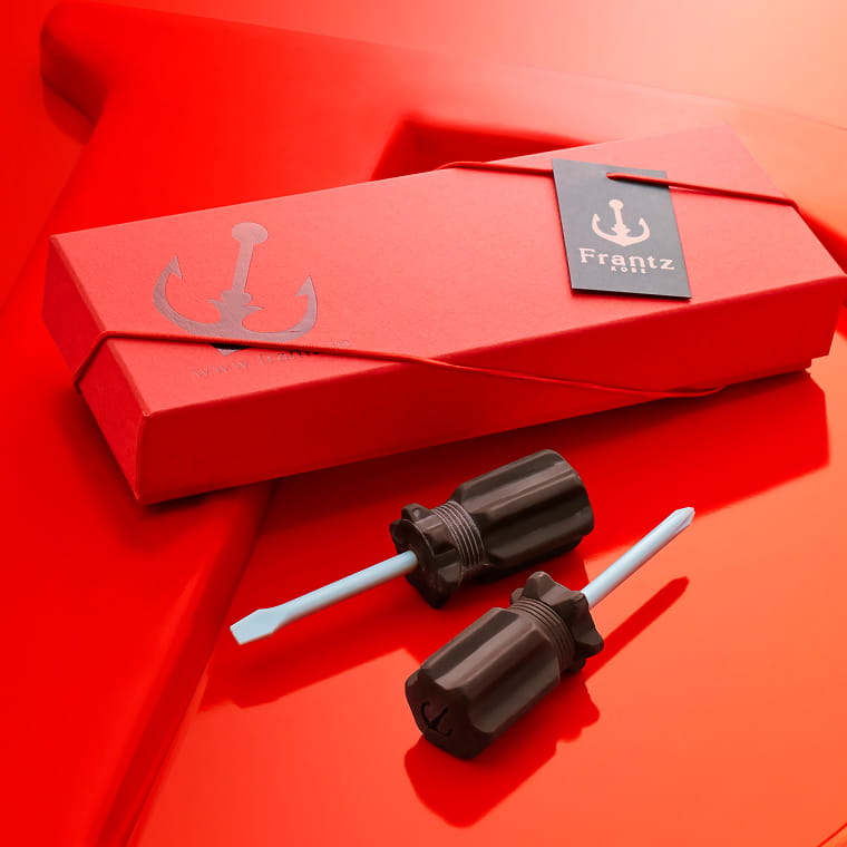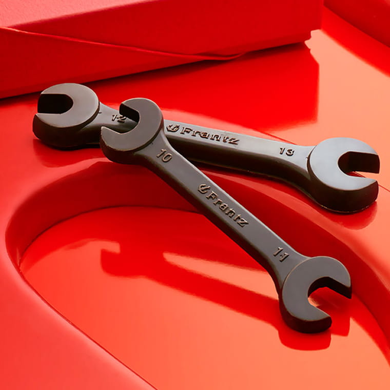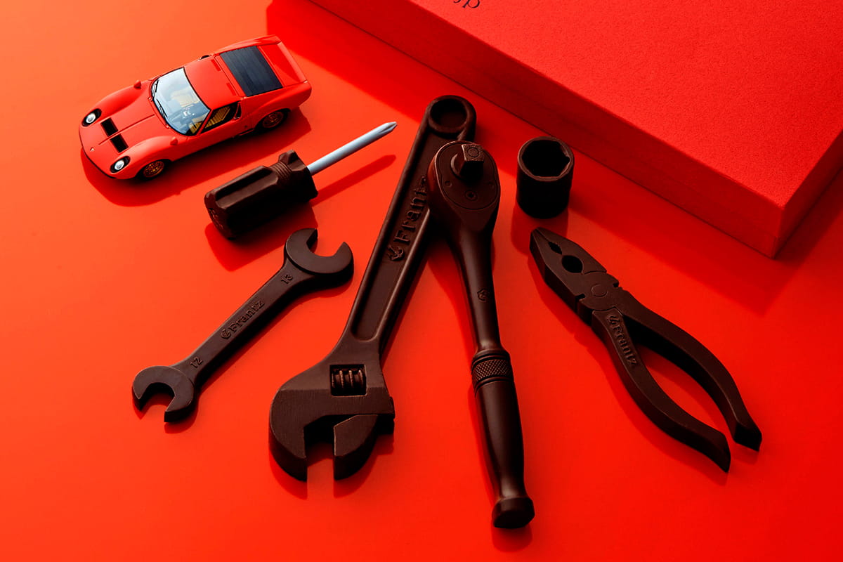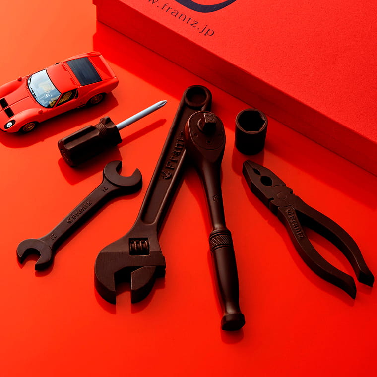 見た目のギミカルなデザインとは裏腹に、神戸フランツのプレミアムチョコレートのみを使用した本格派です。スパナ、ペンチ、ボルトナット、モンキーレンチ、ドライバーなど馴染みのある工具から、ラチェットレンチ、Gレンチなど、マニアックな工具まで。お好みに合わせてパーツを選べる工具チョコレートシリーズ。