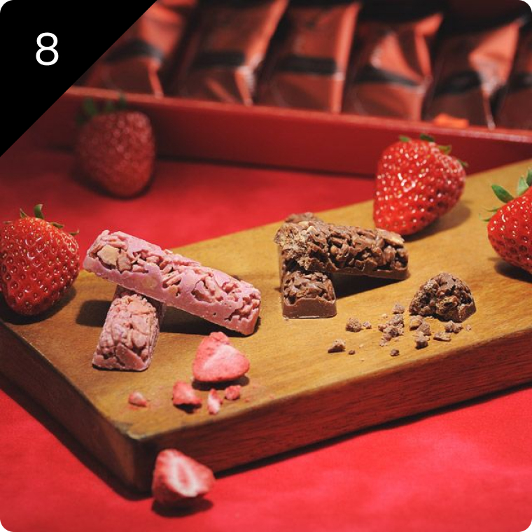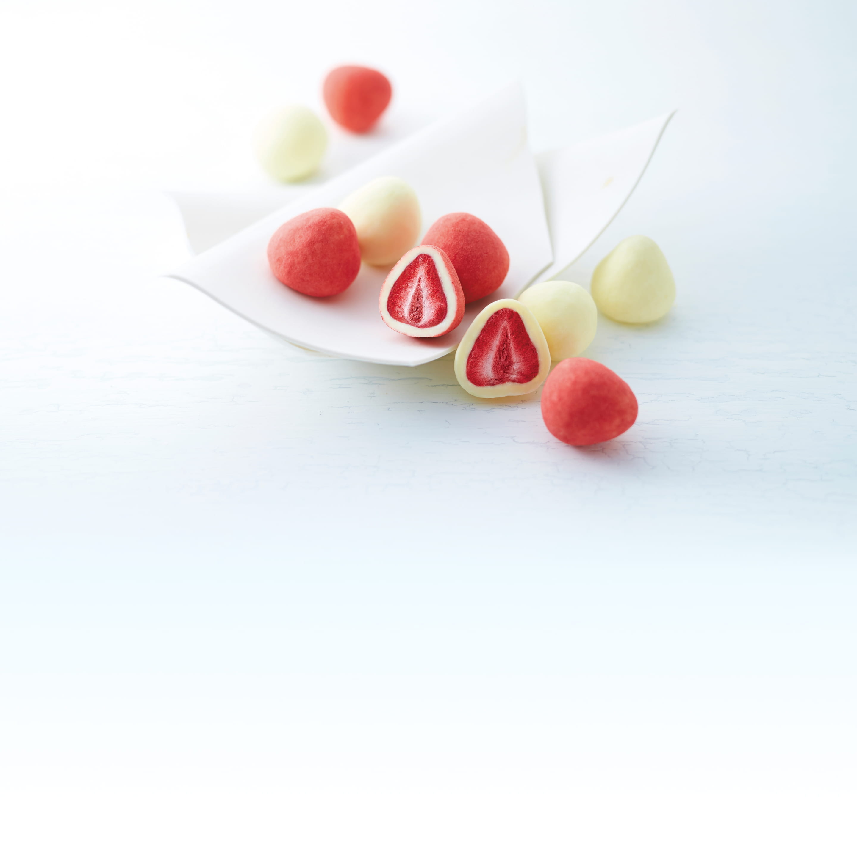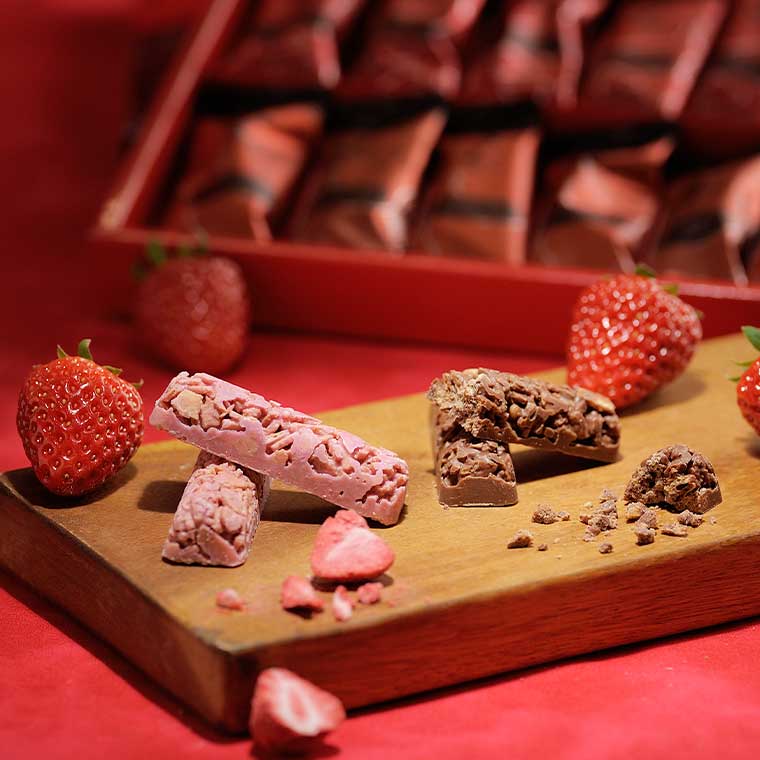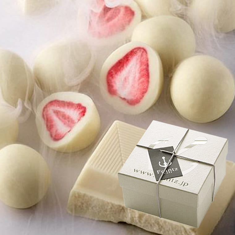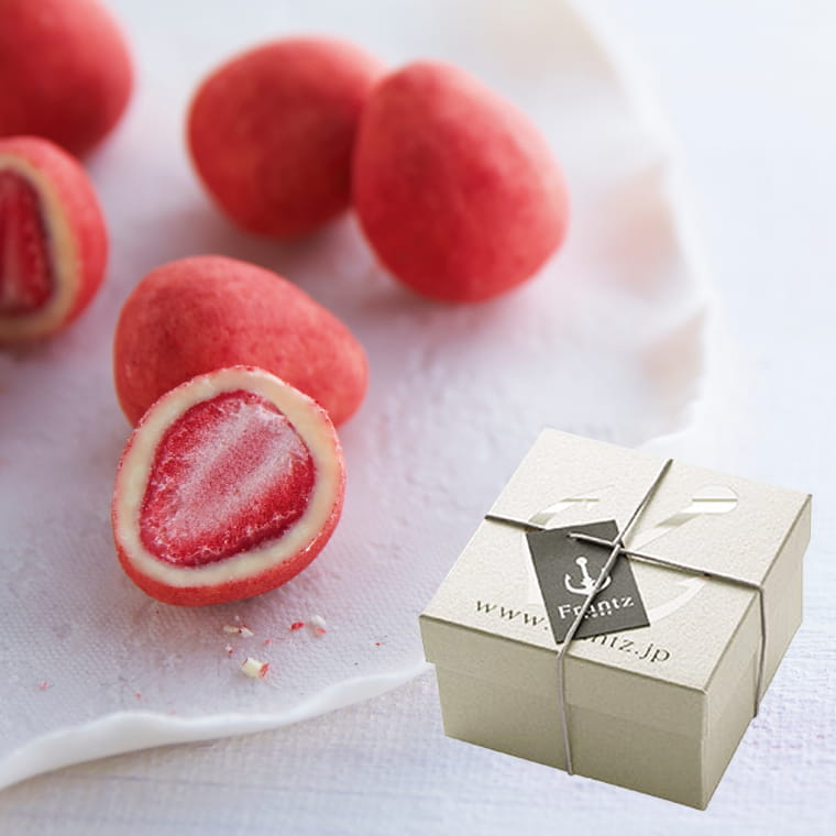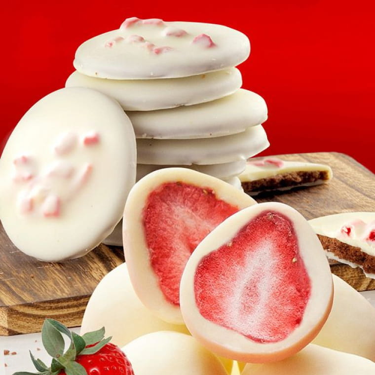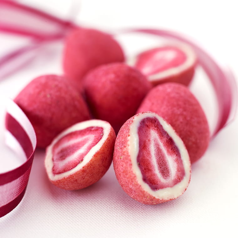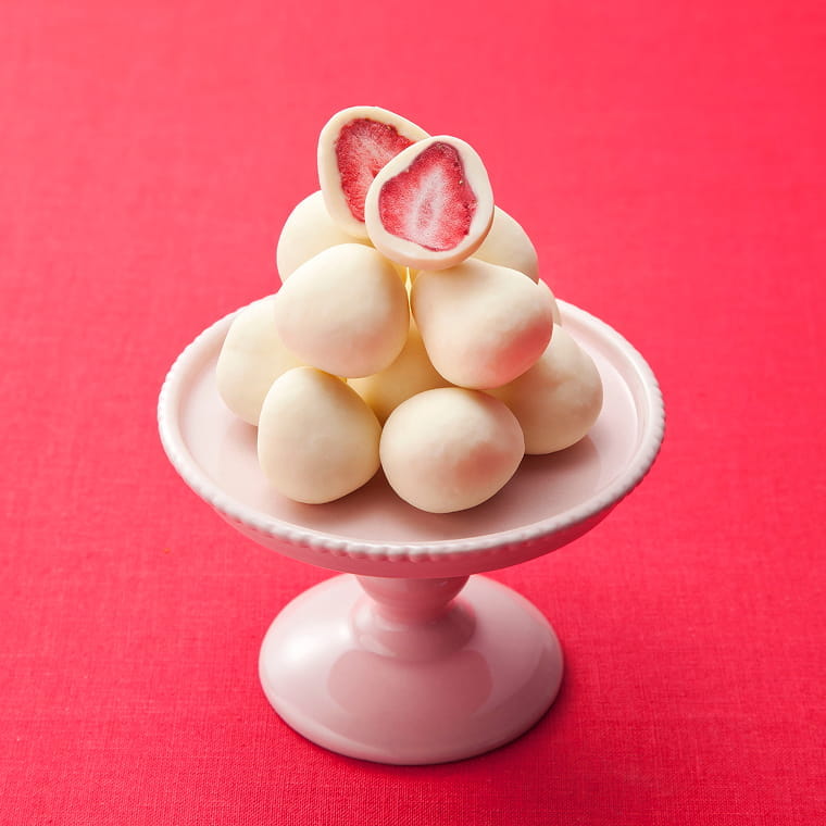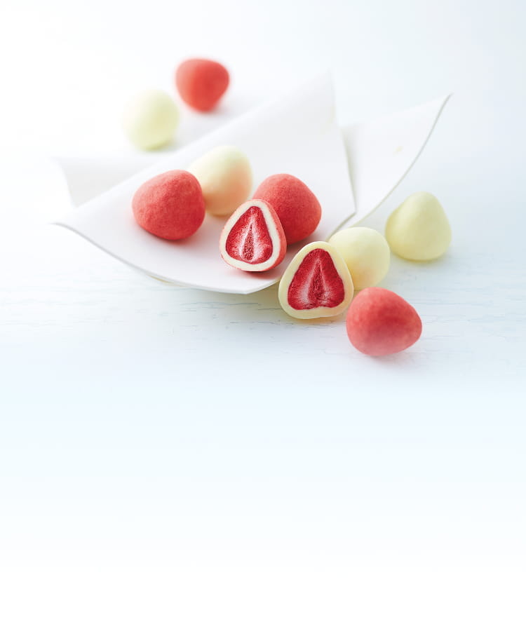 甘酸っぱい苺をフリーズドライにして、ミルク風味のクリーミーなホワイトチョコでコーティング。