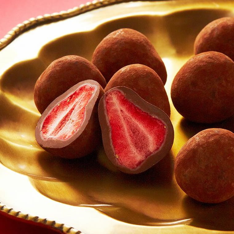 苺をサクサクのフリーズドライにして、ミルク風味のホワイトチョコでコーティング。