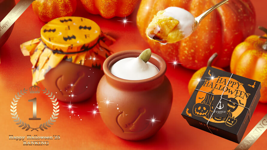 神戸フランツ「ハロウィン」スイーツギフト人気第1位は、【ハロウィン限定】こわ可愛いジャック・オー・ランタンの限定パッケージ入り【神戸魔法の壷プリン®・ホクホクパンプキン4個入】☆