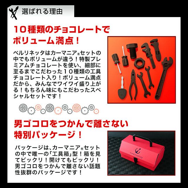 他の画像を見る 送料込み(※1)TV雑誌で話題沸騰!車が好きな人の為のチョコレート※1北海道・沖縄除く【バレンタイン限定】 工具チョコ(R)・カーマニア(R)セットV6【送料込み】【※北海道・沖縄除く】 送料無料 オンライン限定 常温便 ¥ 4,980 税込 在庫切れ 再入荷お知らせ お気に入り登録